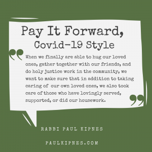 Jewish tradition teaches that the tzedakah we give others technically is not ”our” money; it was placed in our pockets by the Source of All to share with others. By extension, the wages we would pay to those who work for us or the payments we would make for to businesses that we usually frequent or the donations that we would normally donate – but might now not be paid because we are all sequestered at home – are monies that were budgeted for them and might reasonably be considered theirs.