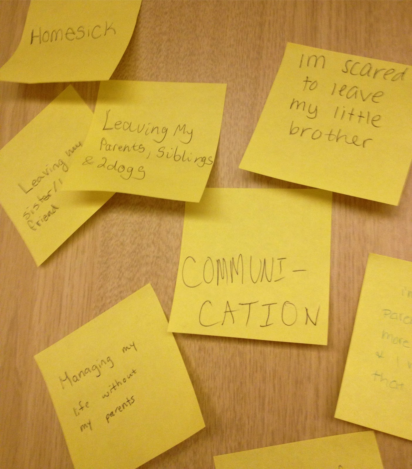 “Take two post-it notes, and write on them your top two concerns, anxieties or agitations about leaving home and family as you go off to college. Stick them on the wall. Now without talking, read through all the answers and as a group collect together similar responses until we have a small number of categories.”